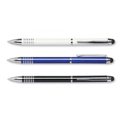 A slimline twist action stylus ballpen in matt black or gloss white lacquered aluminium with bright chrome fittings & a soft rubber stylus tip. Fitted with a metal Parker style black ink refill.